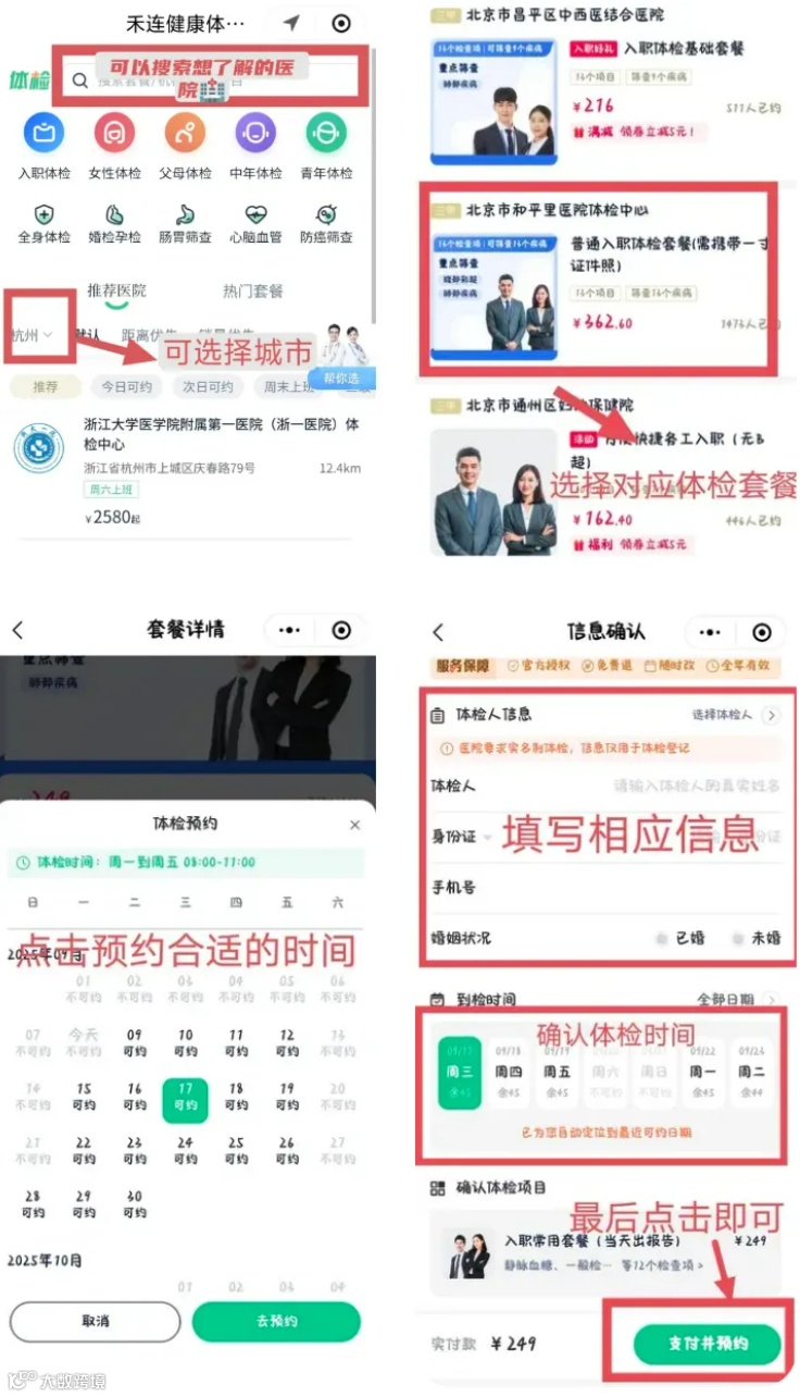 以上如果没有您想体检的医院,或者想了解其他省市区医院的体检套餐及项目价格,如入职体检、健康证、公务员体检、教资体检、全身健康体检、深度体检检查、女性妇科套餐、早癌筛查、专项体检、胃肠镜体检、青年体检、中老年体检、父母体检、高端体检等套餐。请点击下图链接或微信搜索🔍 “禾连健康预约平台”,后按照图中指引,即可快速预约合适的时间,不用线下排长队,省心又省力!↓↓↓