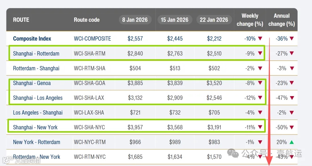 最新数据显示,上海航运交易所1月30日发布的上海出口集装箱运价指数(SCFI)报1316.75点,单周下跌9.7%。更引人关注的是,美西、美东、欧洲、地中海等主要航线运价罕见地出现“集体跌停”:
