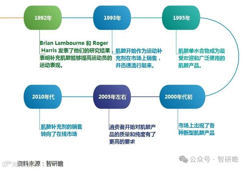 1992年,Brian Lambourne 与 Roger Harris 首次科学验证肌酸可提升运动表现,推动其作为运动补剂进入市场。1993年起,肌酸正式商业化销售,并迅速在健身群体中普及。1995年后,随着研究积累,一水肌酸成为主导产品。2000年代初,肌酸酯、微粉化肌酸等新型产品陆续推出,宣称具备更高吸收率。2005年前后,消费者对产品质量要求提升,推动行业建立更严格的质量控制体系。2010年代,电商兴起加速肌酸线上销售发展,国内外品牌竞争加剧。近年来,行业聚焦复合配方创新,结合蛋白质、碳水化合物等功能成分,优化效果并减少副作用。