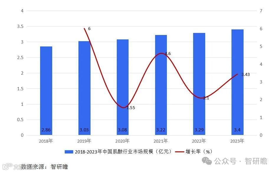 中国为全球肌酸主要生产国和出口国。2022年国内肌酸总产量达3.08万吨。2021年,国内市场肌酸相关产品消费规模达3.22亿元。据智研瞻统计,2018年中国肌酸行业市场规模为2.86亿元,2023年增至3.4亿元,同比增长3.43%。