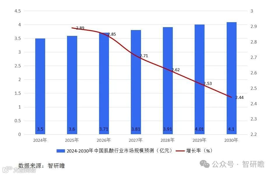 据智研瞻预测,2024–2030年中国肌酸行业市场规模年均增长率将保持在2%–3%,预计2030年市场规模达4.1亿元,同比增长2.44%。