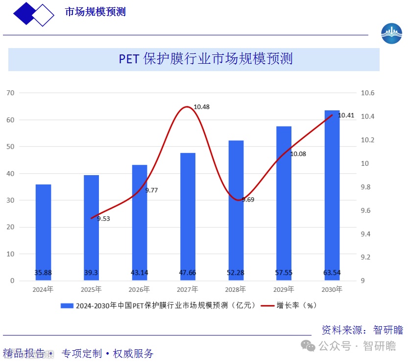 智研瞻预测,2024—2030年中国PET保护膜行业年均复合增长率将在9%—11%之间。到2030年,市场规模有望达到63.54亿元,较2024年实现显著增长。未来发展趋势将聚焦于功能化、环保化与高端化。预测数据如下: