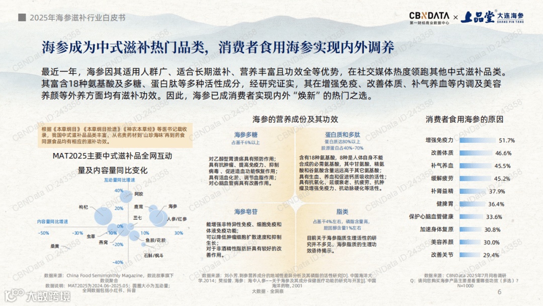 2025年,受慢性病发病率上升和全民健康意识增强推动,中式滋补迎来新一轮发展浪潮。海参凭借突出的营养价值与滋补功效,成为消费市场关注焦点,行业在消费升级与产业创新双重驱动下加速转型升级。