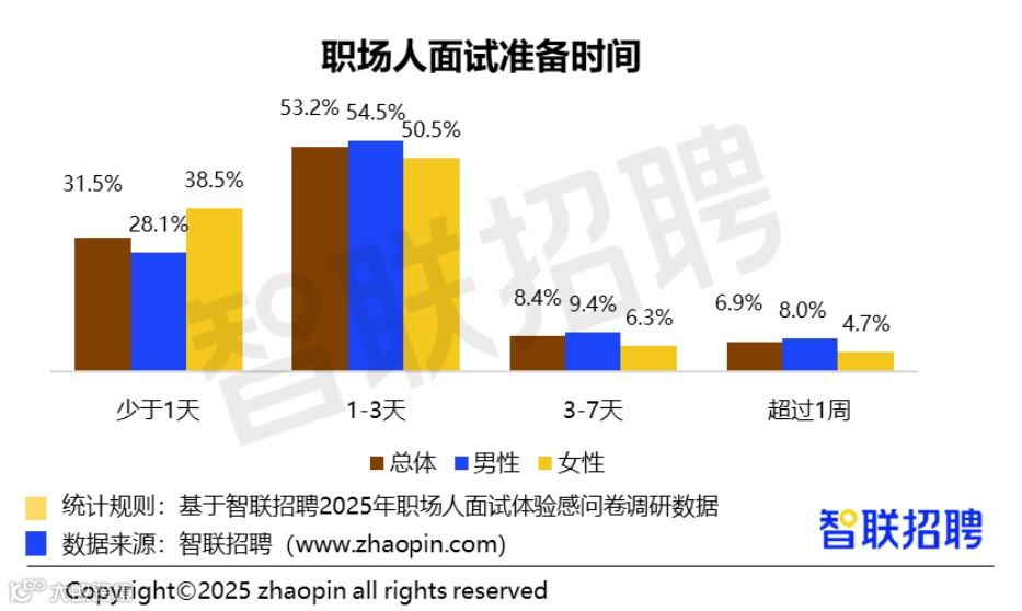 53.2%职场人1-3天完成面试准备,女性“闪电备战”比例更高