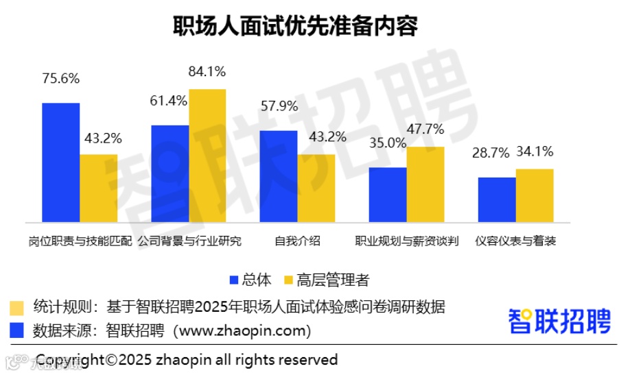 在有限准备时间内,75.6%的职场人优先研究岗位职责与技能匹配情况。而高层管理者中,84.1%更关注公司背景与行业前景,反映出不同职级的关注重心差异:基层聚焦“能做什么”,高管着眼“赛道潜力”。