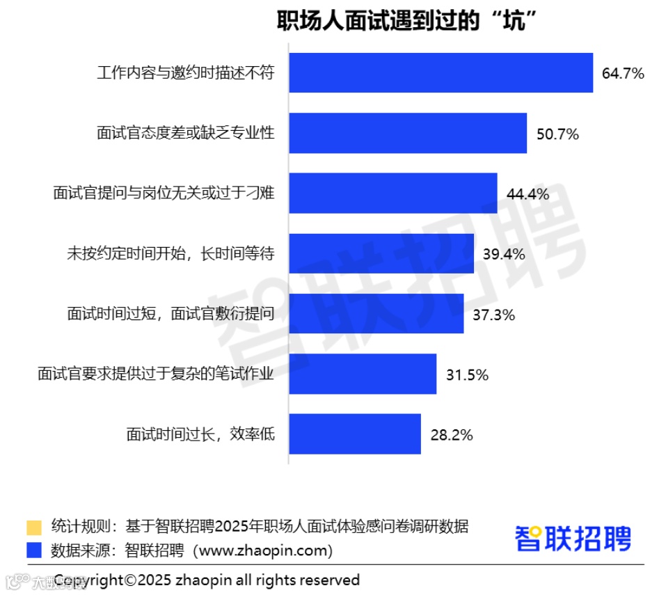 调研显示,64.7%的职场人在面试中发现实际工作内容与岗位描述严重不符,JD描绘为“高精尖人才”,实则多为“打杂全能型”。此外,面试官态度差或缺乏专业性也被视为第二大痛点,如质疑稳定性、回避技术提问等行为频现,影响候选人体验。