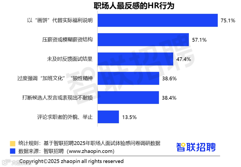 面对“强势气场”的面试官,46%表示可接受但需尊重,29.1%明确抵制“高压式”面试。而在HR行为中,“以空头承诺替代实际福利”最为人反感,75.1%的受访者表示难以接受“画饼”式激励,强调待遇透明与兑现能力的重要性。