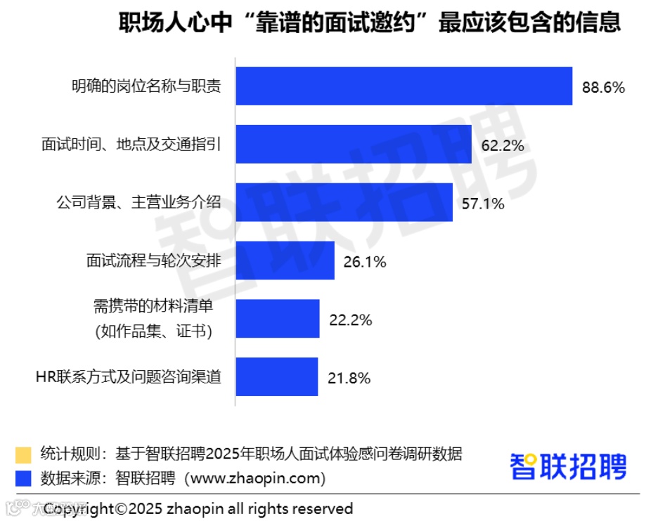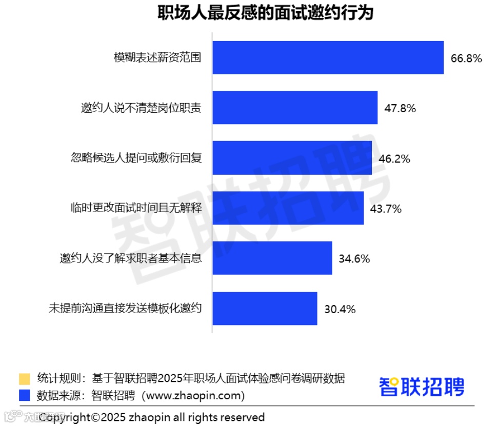 高达88.6%的职场人认为,靠谱的面试邀约应包含清晰的岗位名称与职责。此外,超过六成认为需明确面试时间与地点。而最令人反感的行为是“模糊薪资范围”,占比达66.8%。紧随其后的是“无法说明岗位职责”(47.8%),双重信息不透明加剧求职焦虑。
