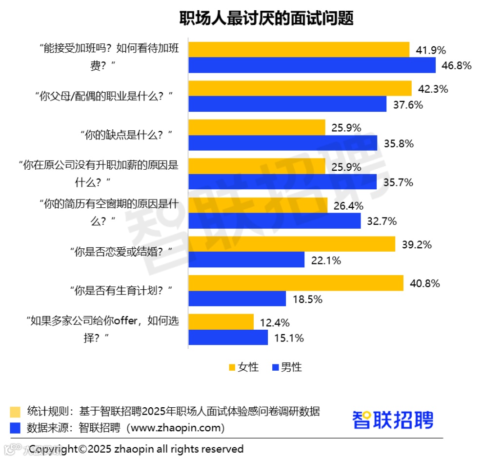 面试中的敏感问题呈现性别分化。男性最抵触被问及“是否接受加班”“如何看待加班费”,视其为过度压榨信号;女性则普遍反感婚育家庭类提问,如“是否有恋爱/结婚计划”“生育安排”等。此类“定制化提问”暴露部分企业仍将婚育视为女性职业风险的认知偏差。