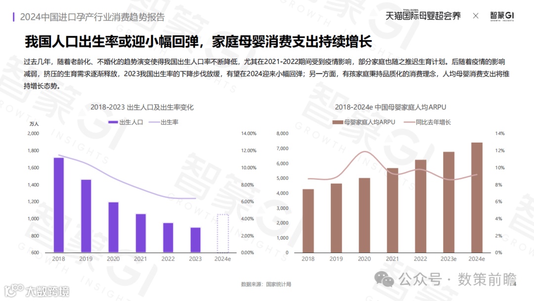人口出生率有望小幅回升,家庭在母婴领域的消费支出持续增长。线上渠道成为推动孕产行业规模扩张的重要力量,进口商品市场份额稳步提升。