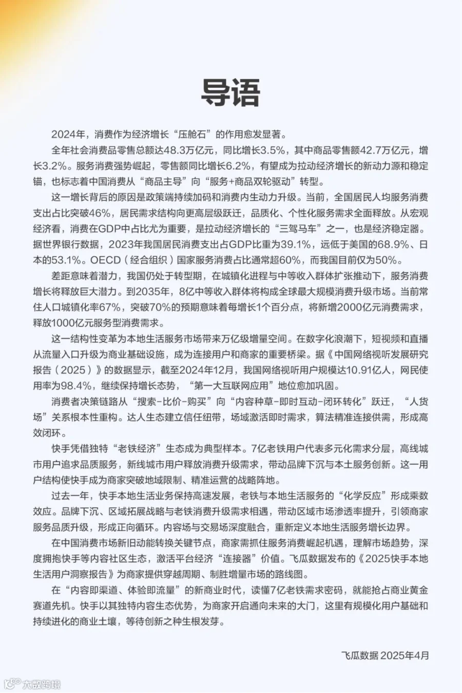 2025年,中国消费市场加速向“服务+商品双轮驱动”转型,本地生活服务成为经济增长新引擎。商家需把握服务消费升级机遇,深入理解市场趋势,积极融入快手等内容平台生态,释放平台经济的连接价值。本报告旨在为商家提供穿越周期、开拓增量市场的战略路径。