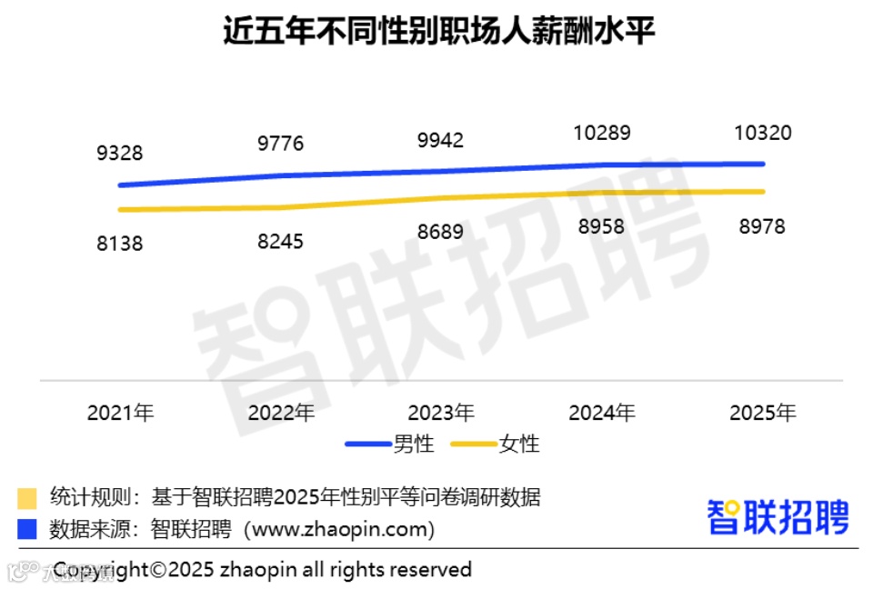 - 职场女性平均月薪达8978元,较去年有所上升;男性为10320元,薪酬差距维持在13%左右。