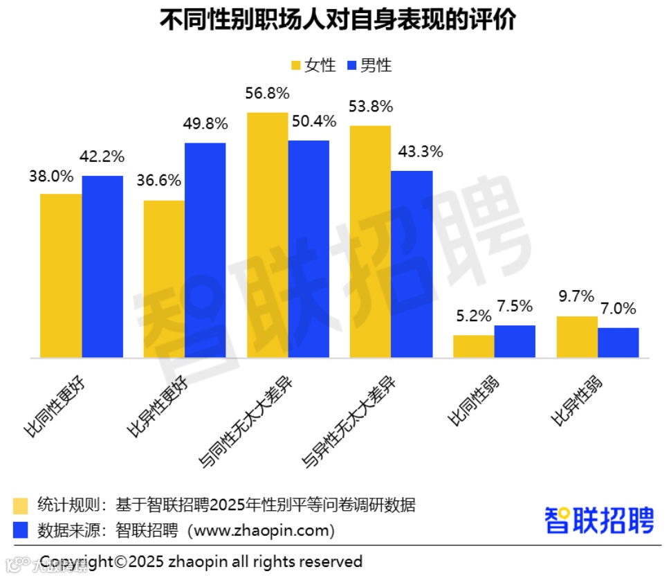 调研显示,36.6%女性认为自身工作表现优于同职级男性,较去年的32.8%有所提高;与同性对比时,该比例为38%。相比之下,49.8%男性认为自己优于女性同事,显示出更强的自信。尽管如此,女性对自身能力的认可度正在稳步上升。