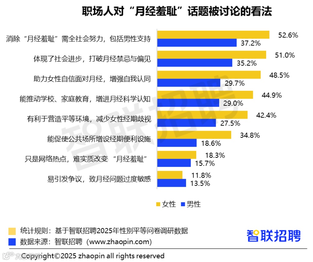 - 52.6%女性认为消除“月经羞耻”需全社会共同努力。
