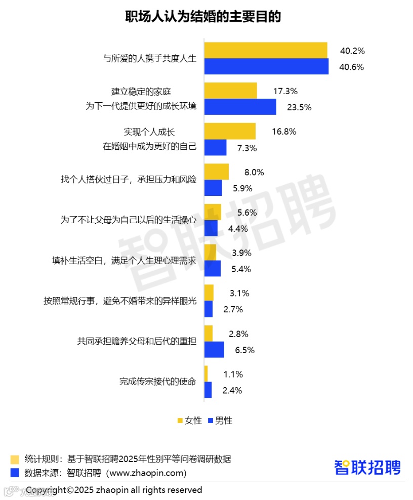 4成职场人认为结婚目的是与所爱的人携手人生,目的为传宗接代者不足2%