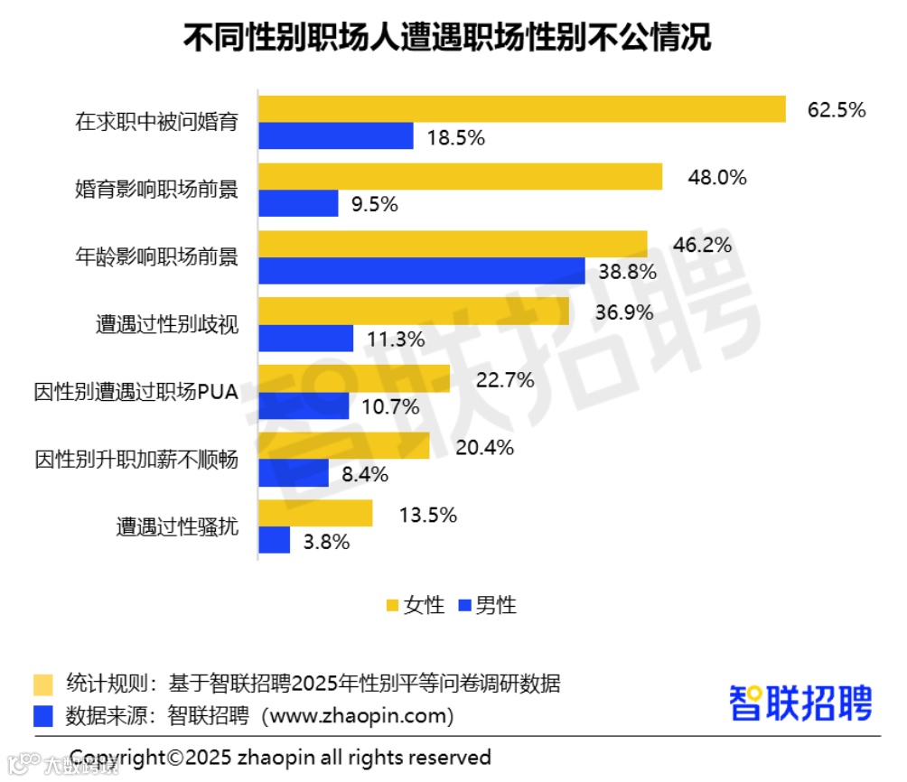 调研显示,62.5%女性在求职过程中被询问婚育状况,较去年的48.8%明显上升,而仅有18.5%男性有过类似经历。此外,48%女性表示婚姻影响职业前景,46.2%认为年龄带来限制,均远高于男性。尽管遭遇明显性别歧视的比例从去年的54%降至36.9%,但仍显著高于男性的11.3%。相关法律法规执行亟待加强,企业应主动杜绝招聘歧视,营造公平环境。