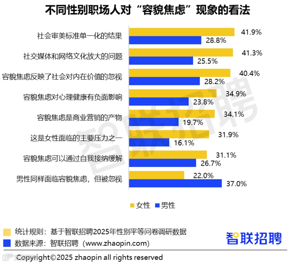 35.2%职场人认为单一审美导致“容貌焦虑”,37%男性认为男性容貌焦虑被忽视