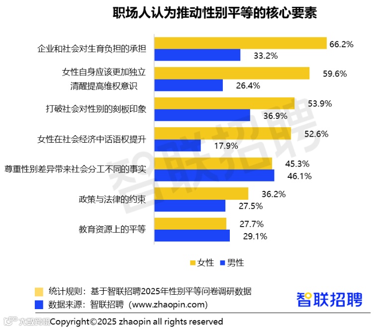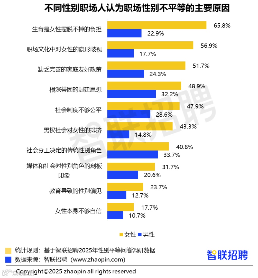 - 65.8%女性认为生育负担是职场不平等主因,仅22.9%男性认同。