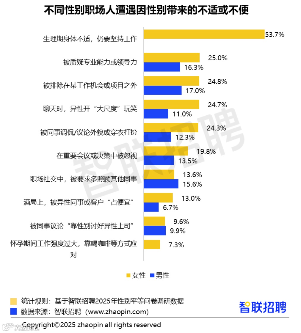 除显性歧视外,职场中仍存在诸多隐蔽的“微歧视”。83.1%女性表示曾因性别感到不适,远高于男性的54.1%。具体表现为:53.7%女性在生理期需坚持工作;25%因性别被质疑专业能力或领导力(男性16.3%);24.8%被排除在重要项目之外(男性17%)。这些现象提示企业需构建更具包容性的职场生态。