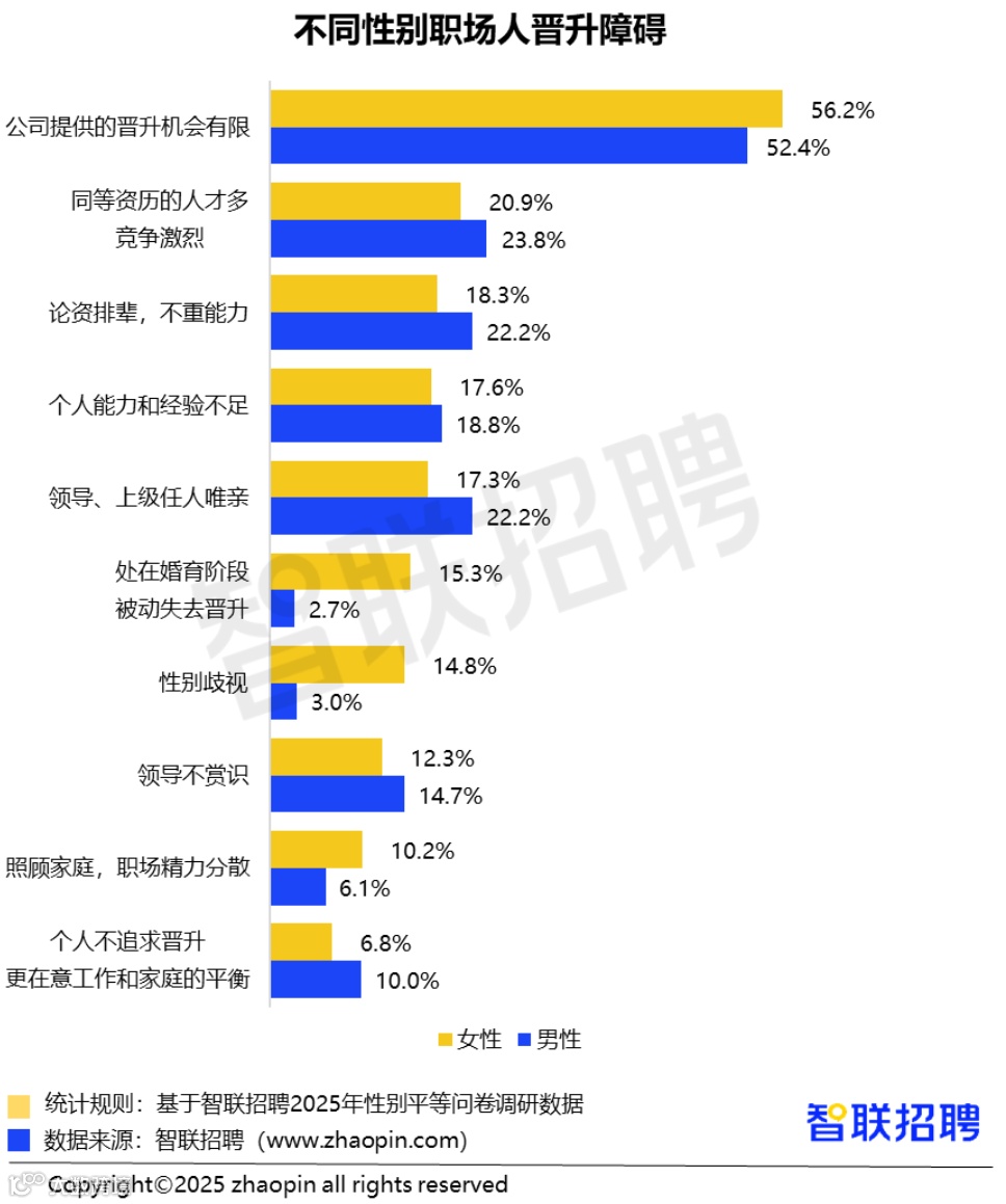 - 15.3%女性因婚育影响晋升,远高于男性的2.7%。