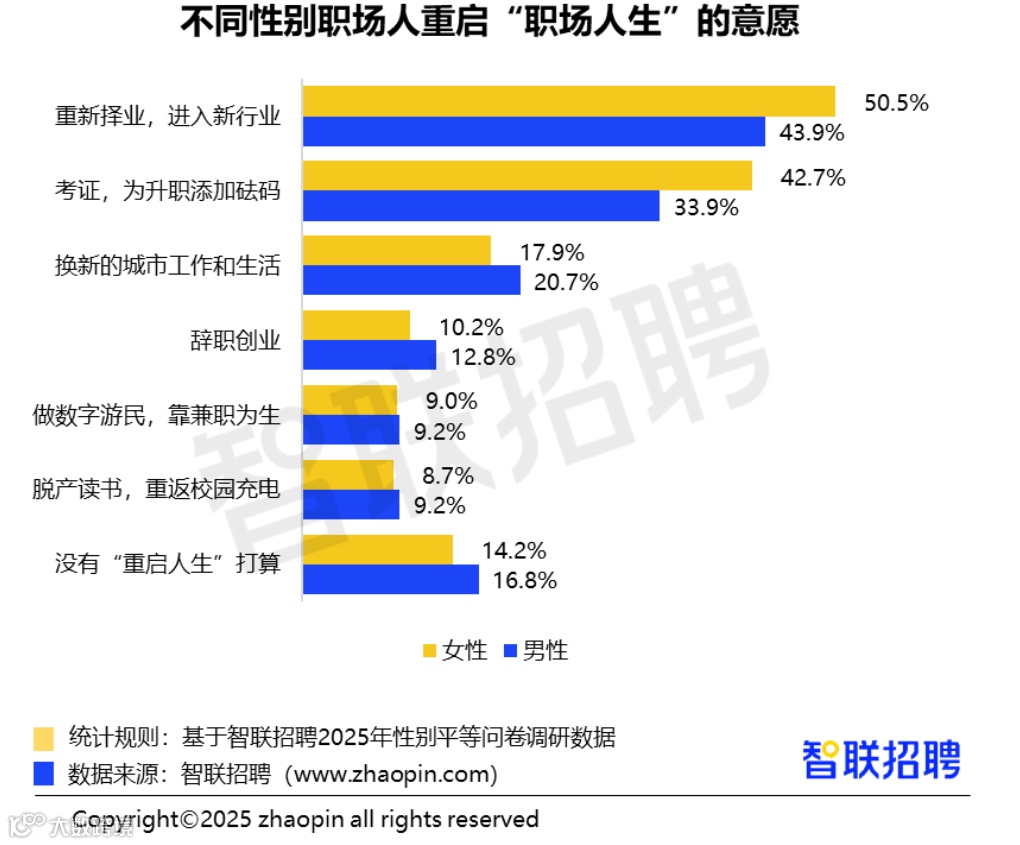 - 超半数女性有意转行或考证,提升竞争力意愿强于男性。
