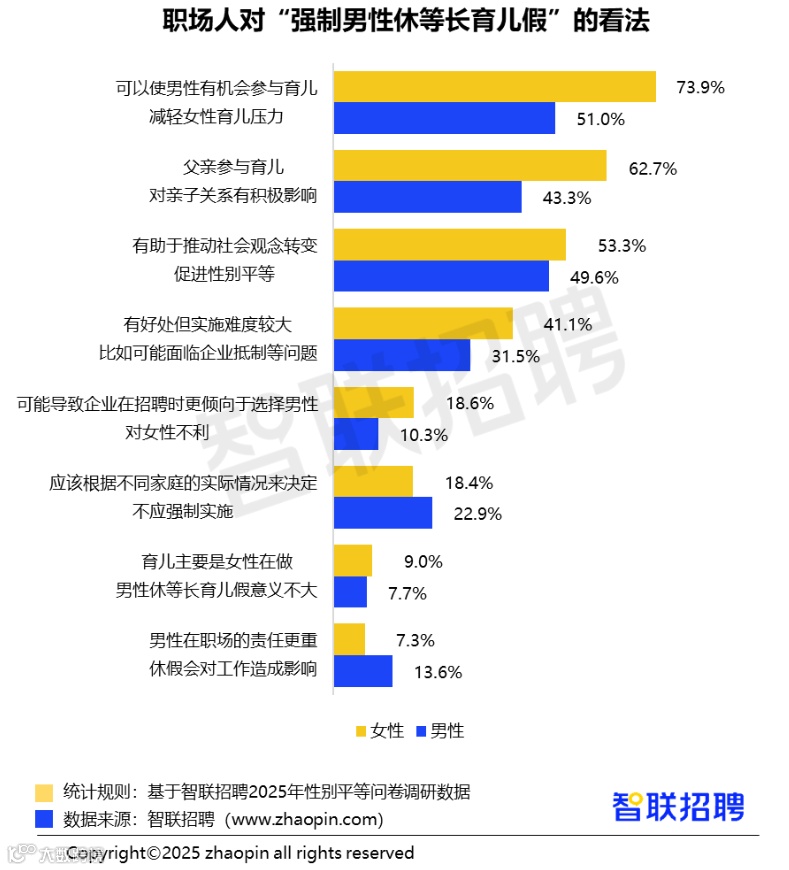 目前我国女性产假普遍为128–188天,男性陪产假多为7–30天。调研显示,62.3%受访者支持“强制男性休等长育儿假”,认为此举可促进父亲参与育儿、缓解女性压力。其中女性支持率达73.9%,男性为51%。73.9%女性认为父亲参与有益亲子关系,但男性认同度仅43.3%,提示男性需进一步提升育儿责任意识。也有14.4%担忧此举可能导致企业更倾向招聘男性。