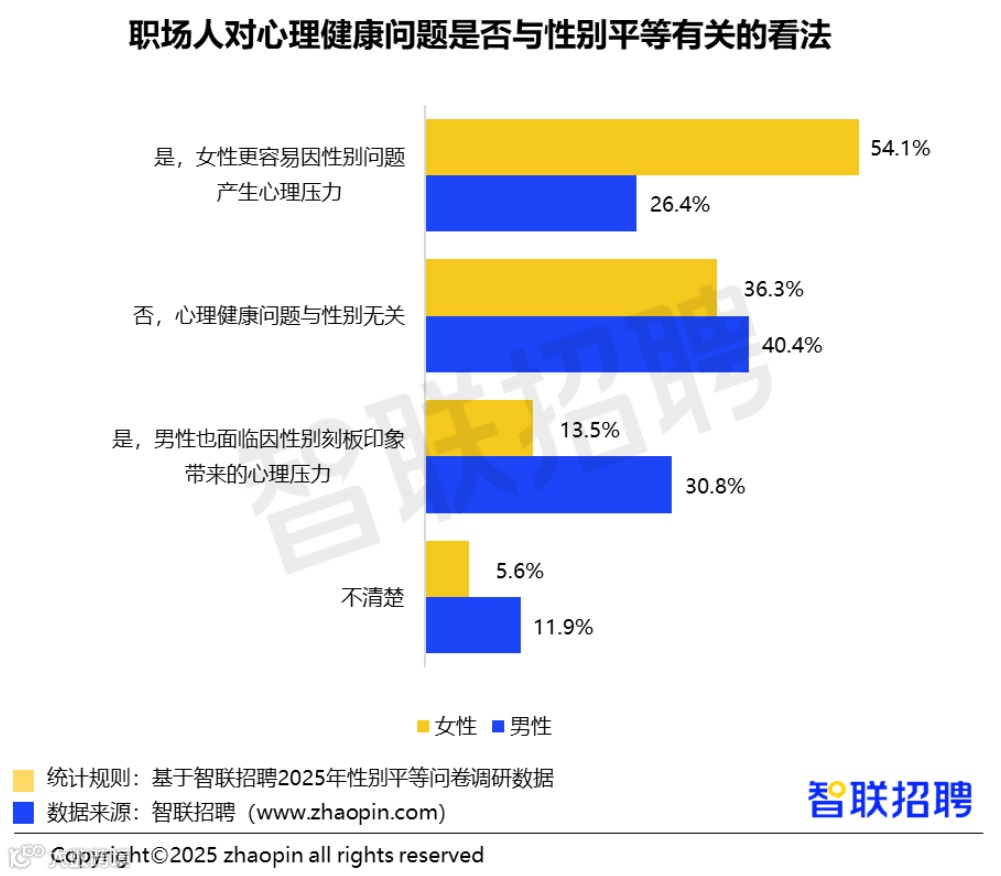 超6成职场人认为心理健康问题与性别平等有关,女性承压更大