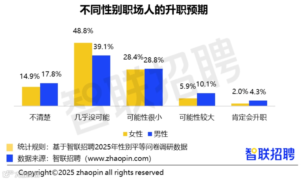 升职是多数职场人的重要目标,但今年仅有7.9%的女性表示对升职“可能性较大”或“肯定会升职”,较上年的21.5%断崖式下滑。相比之下,14.4%男性持乐观态度,虽也低于去年,但仍高于女性。AI技术快速发展与产业结构调整带来的不确定性,显著削弱了职场人群的职业发展预期。