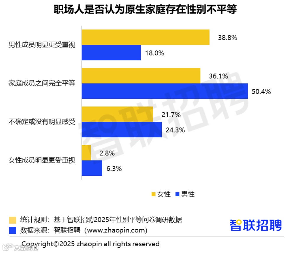 原生家庭中的性别偏见可能代际传递并影响个体发展。调研显示,38.8%女性认为家中男性成员更受重视,仅2.9%认为女性更受优待。超过半数男性认为家庭成员完全平等,18%承认存在“重男轻女”现象。数据表明,女性对此类不平等的感受更为深刻。