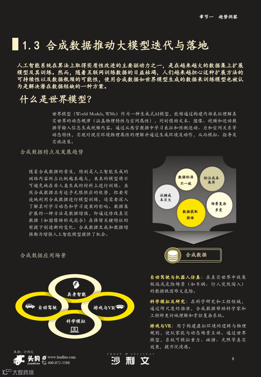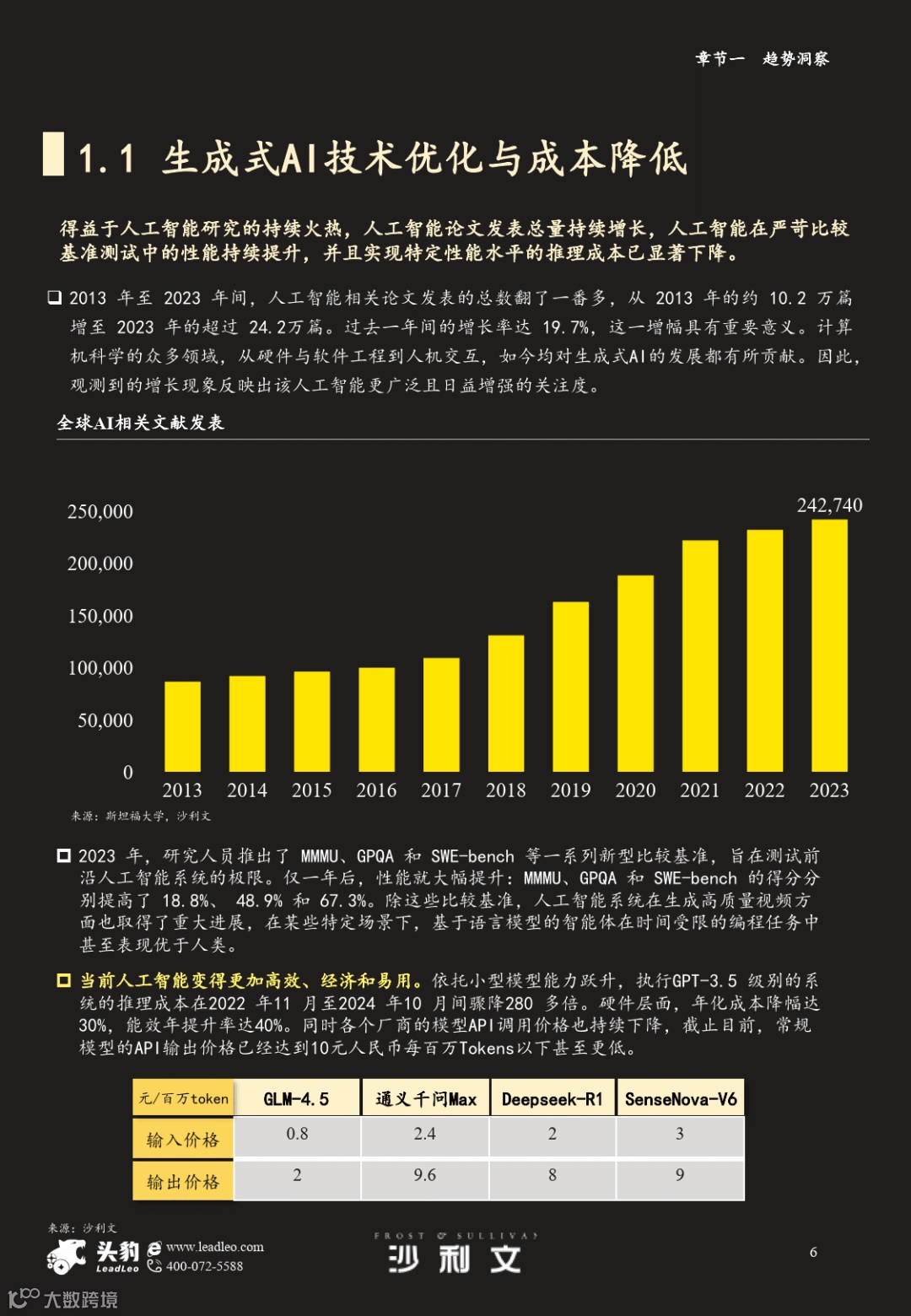 生成式AI呈现四大核心方向:一是技术优化与成本下降。2013至2023年,AI相关论文数量翻倍,部分基准测试性能显著提升,GPT-3.5级别模型推理成本大幅降低,API输出价格持续走低。二是Agentic AI成为高级形态,具备自主性与目标导向,可独立执行复杂任务,被视为生成式AI的下一阶段演进方向。三是合成数据缓解训练数据短缺问题,世界模型可模拟现实环境辅助决策,广泛应用于多个领域。四是AI安全治理逐步完善,形成覆盖“数据—模型—业务”的全链路保障体系。