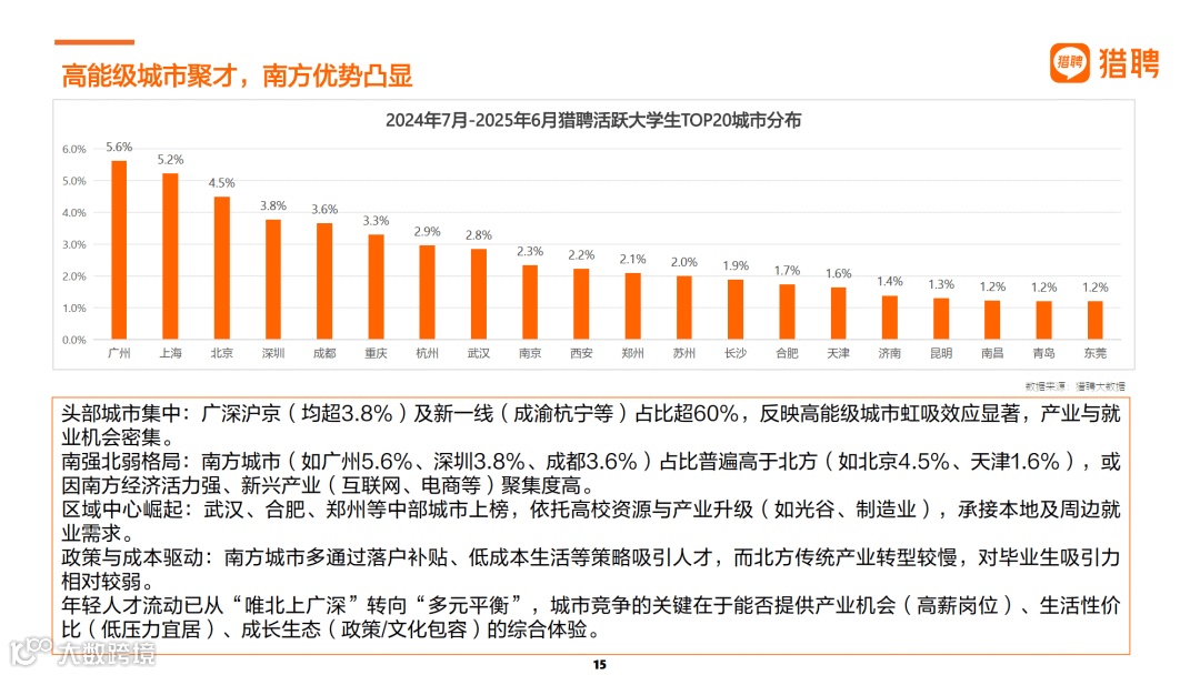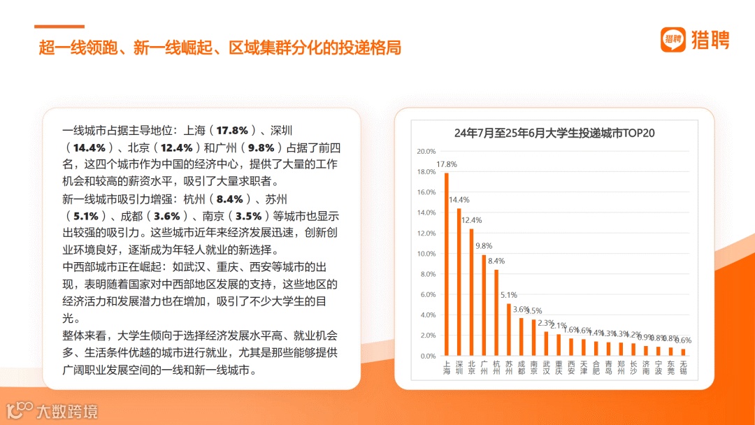 从活跃用户数据看,女性应届生略多于男性(51.1%)。学历分布中,本科占比超半数,硕士比例升至17.11%。热门专业集中在计算机科学与技术、工商管理等领域。城市分布上,广州、上海、北京等高能级城市吸引力强,南方城市整体优势突出。
