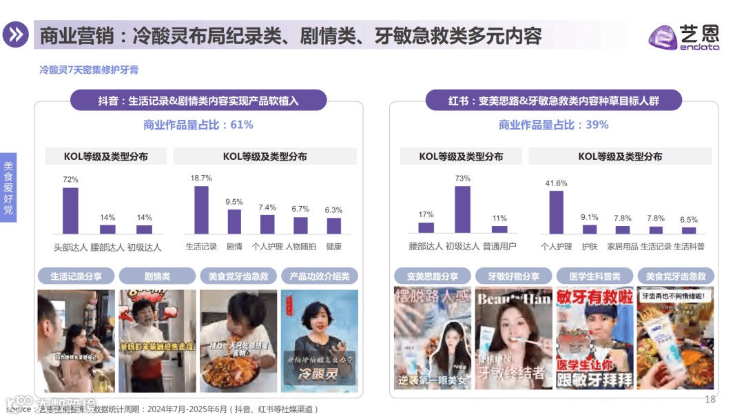 以年轻群体为主,偏好重口味与甜食,关注牙齿敏感问题,倾向选择抗敏感类牙膏。冷酸灵通过多元化内容营销精准触达该人群。