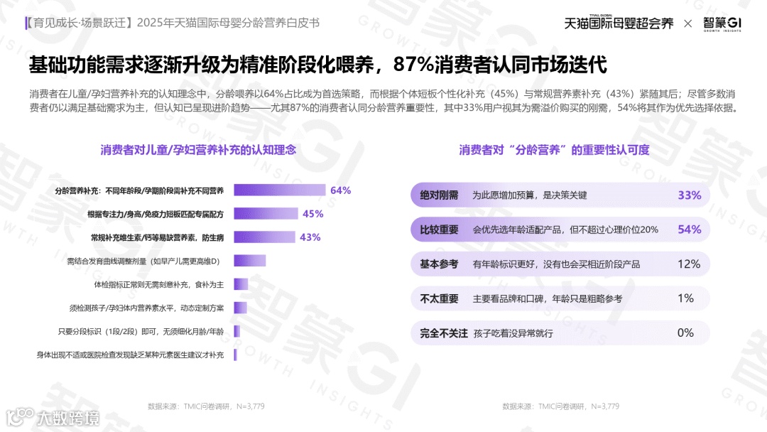 天猫国际孕婴童消费主力集中于高线城市“精致妈妈”群体,中大童营养消费需求快速增长。调研显示,87%的消费者认同分龄营养的重要性,营养需求已从基础补充转向精细化、阶段化管理。