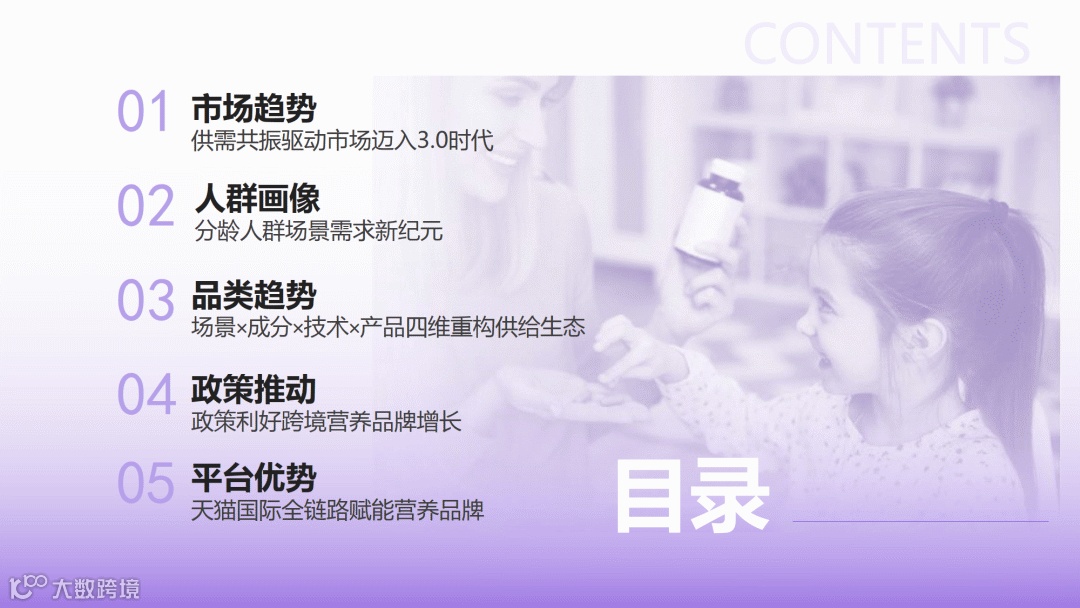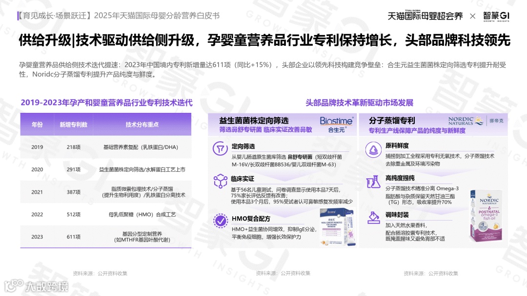 政策层面,国家积极推进未成年人营养精准化管理与孕产妇健康保障,相关专利数量稳步增长,头部品牌技术优势显著。全球与中国孕婴童营养品市场均呈现稳步扩容态势,供需共振推动行业进入3.0阶段,消费者逐步迈向全周期、精准化营养干预。天猫国际在该领域占据领先市场份额,吸引高质量客群,平台聚能效应日益凸显。