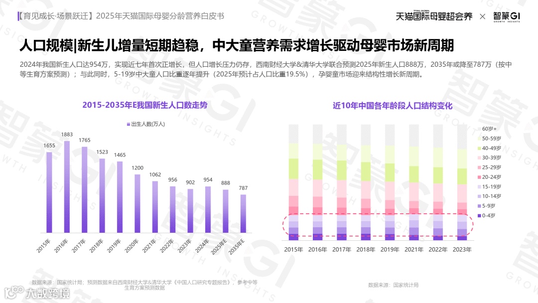 2024年我国新生人口达954万,实现首次正增长,但长期生育压力仍存。与此同时,5-19岁中大童人口占比持续提升,推动母婴市场向结构性增长转型。居民可支配收入上升叠加育儿成本增加,进一步释放孕婴童营养品市场潜力。