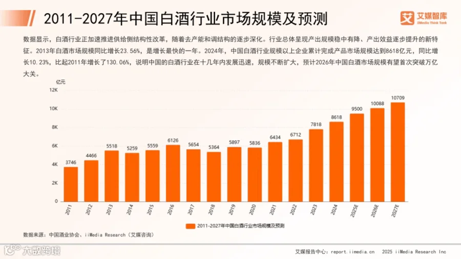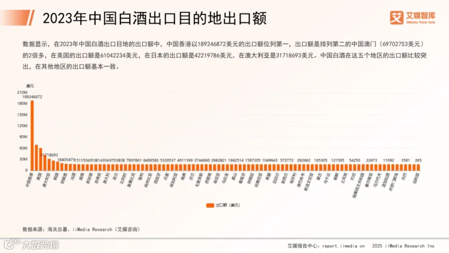 2025年中国白酒行业保持稳步增长,2024年规模以上企业市场规模达8618亿元,同比增长10.23%,较2011年累计增长130.06%,预计2026年将突破万亿元大关。出口方面,中国香港为最大出口目的地,2023年出口额达1.89亿美元,显著高于澳门(6970万美元)和美国(6104万美元)。
