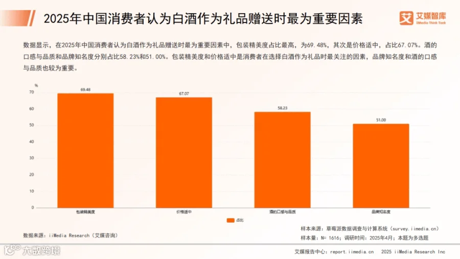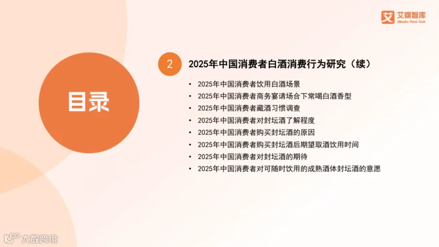 主要消费场景为朋友相聚(45.60%)和家庭聚会(40.06%)。69.60%的消费者有藏酒习惯,52.70%愿意购买可即时饮用的成熟封坛酒,30.54%关注封坛酒的品质保障。