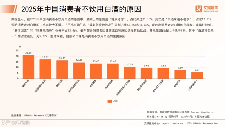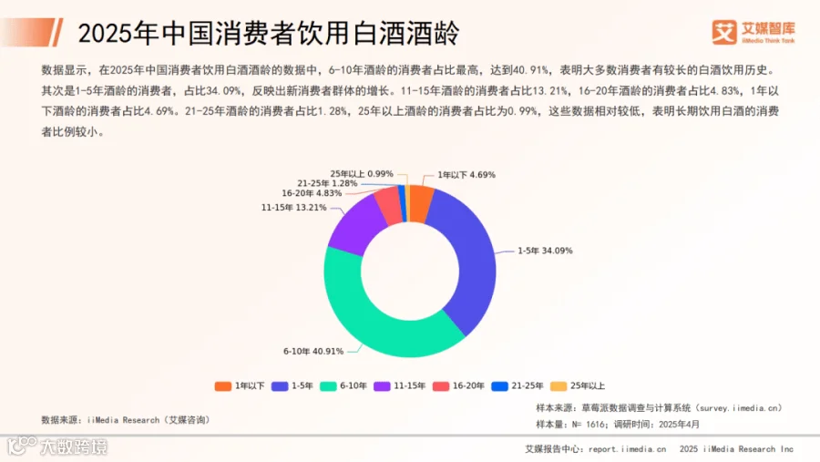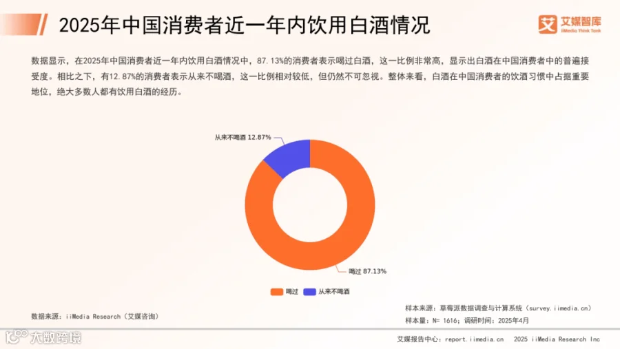 近一年内,87.13%的消费者饮用过白酒,其中酒龄6-10年的占比40.91%,1-5年的占34.09%,显示新消费群体持续扩大。不饮酒人群中,21.15%出于健康考虑,17.31%因口感不适。