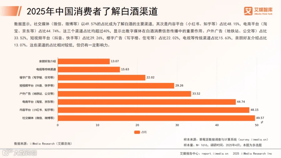 线下渠道仍占主导地位(68.18%),主要通过酒类专营店/烟酒店(57.92%)和酒厂直营店(55.83%)购买;线上渠道渗透率达67.33%,综合电商平台占比最高(70.25%),外卖平台次之(56.54%)。
