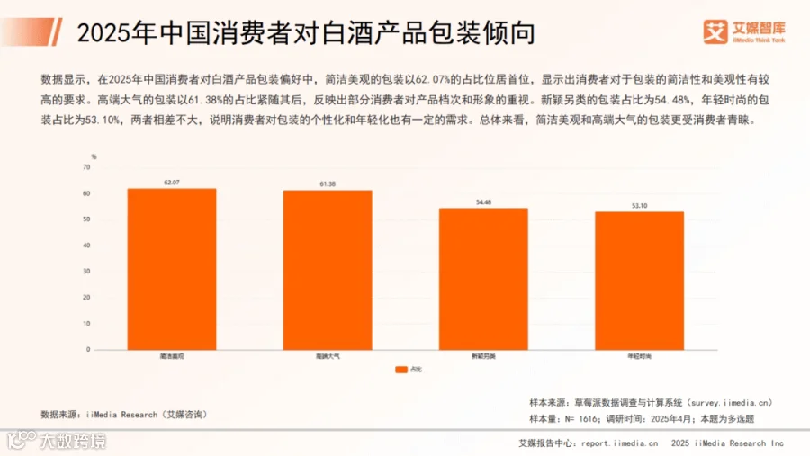 消费决策中,口感是首要因素(37.50%),40-49度白酒最受欢迎(50.71%),价格集中在501-1000元区间(37.22%)。香型偏好以清香型(45.60%)、酱香型(43.04%)和浓香型(41.76%)为主,商务宴请场景中浓香型使用率达53.14%。