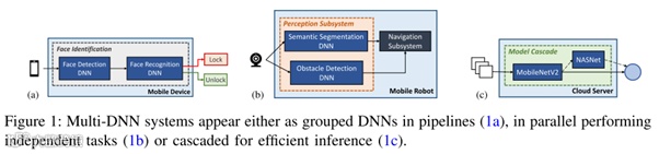 在过去十几年里,深度神经网络(DNN)得到了广泛应用,例如移动手机,AR/VR,IoT和自动驾驶等领域。复杂的用例导致多DNN模型应用的出现,例如VR的应用包含很多子任务:通过目标检测来避免与附近障碍物冲突,通过对手或手势的追踪来预测输入,通过对眼睛的追踪来完成中心点渲染等,这些子任务可以使用不同的DNN模型来完成。像自动驾驶汽车也是利用一系列DNN的算法来实现感知功能,每个DNN来完成特定任务。然而不同的DNN模型其网络层和算子也千差万别,即使是在一个DNN模型中也可能会使用异构的操作算子和类型。