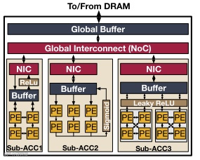 结合动态可重构和定制化的静态调度策略,在NPU中设计多个子加速器,每个子加速器都是针对于特定的神经网络层或者特定的网络操作。这样调度器可以适配多个DNN模型的网络层到合适的子加速器上运行,还可以调度来自于不同DNN模型的网络层在多个子加速器上同步运行。这样做既可以节省重构架构带来的额外硬件资源消耗,又可以提高不同网络层处理的灵活性。