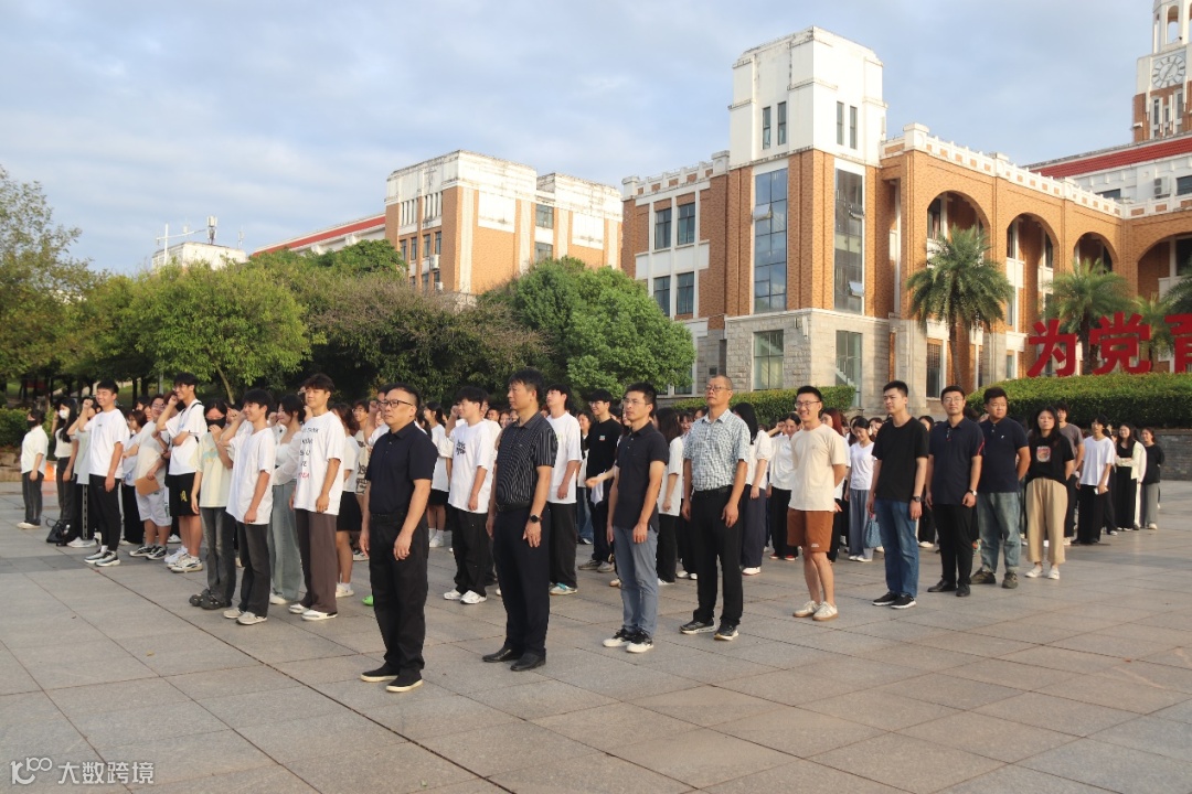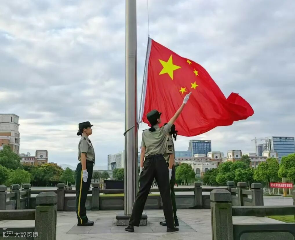 国旗护卫队迈着铿锵有力的步伐,整齐划一地护送国旗向国旗台行进。伴随着庄严的《义勇军进行曲》旋律,五星红旗缓缓升起,全场师生肃立,行注目礼。
