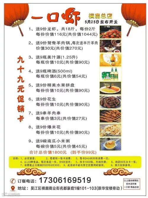横扇一口虾现推出99元套餐卡.每次送九样.总共送九次.详情看下图.办卡地点横扇商业街186–188号(原华宝楼旁)欢迎您的到来.办卡热线17306169519(微信同步)