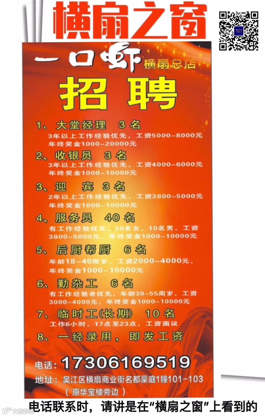 横扇工作地址:横扇仓浦路455号.联系人高超杰(15162387752).