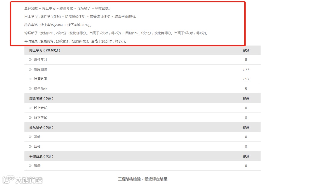 总评分数=平时成绩总分×60%+期末分数×40%,最终成绩60分以上,则该门课程成绩合格。