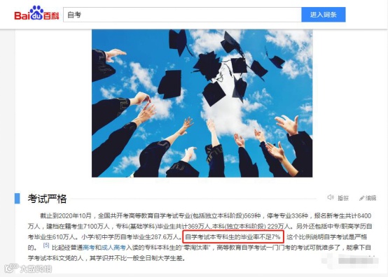 据百度百科上的数据,截止到2020年10月,自学考试毕业率不足7%