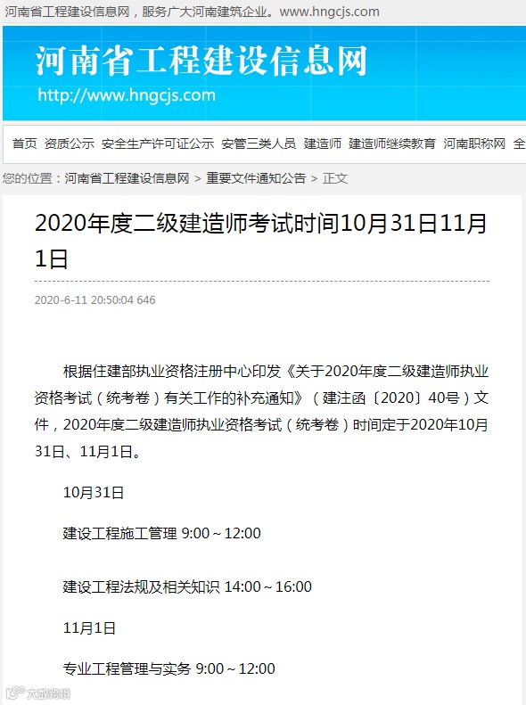 虽然目前福建省还未发布官方通知,但在福建省建设执业资格注册中心官网在线咨询中得知:福建今年二建考试采用全国统考卷,考试时间定于2020年10月31日、11月1日,具体内容如下: