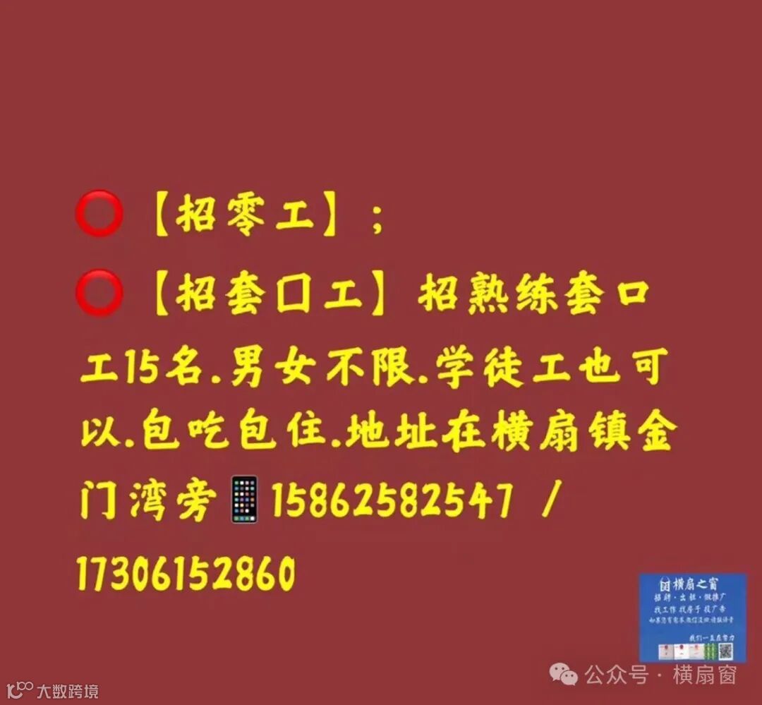 ⭕【招套囗工】招熟练套口工15名.男女不限.学徒工也可以.包吃包住.地址在横扇镇金门湾旁📱15862582547 / 17306152860