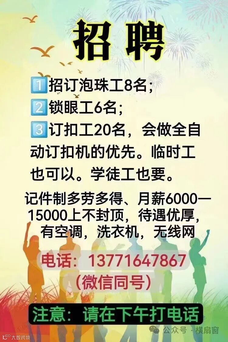 3.订扣工20名,会做全自动订扣机的优先。临时工也可以。学徒工也要。